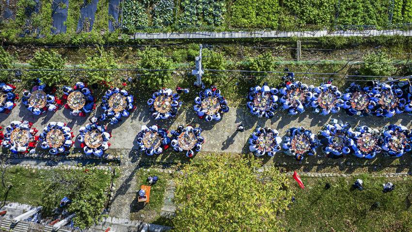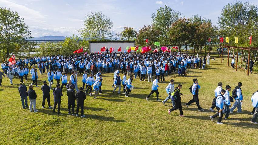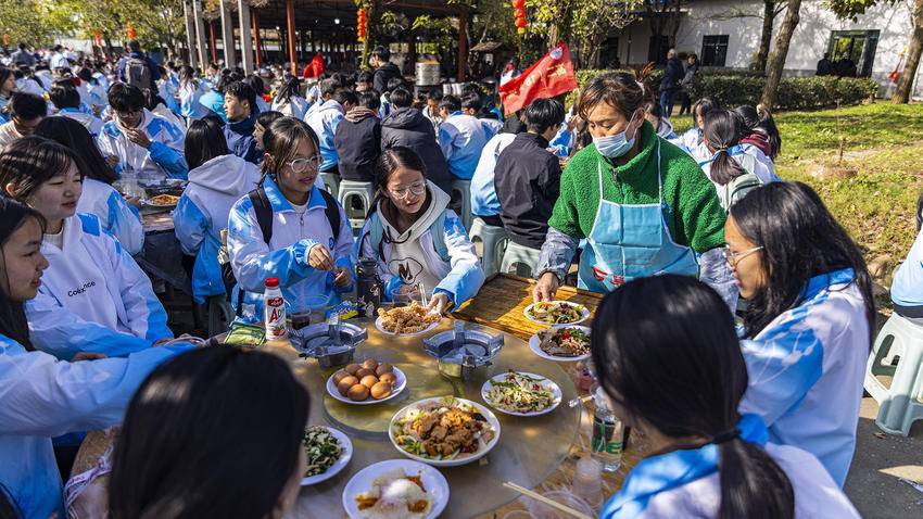 拉练路程虽长,但同学们步履坚定,感受自然之美,一路欢歌笑语。到达目的地仙风小镇后,百桌流水席摆放在廊道,锅里热气腾腾,散发着诱人的香味。千名学子品尝着地道的农家美食,体验了一场别开生面的民俗盛宴。