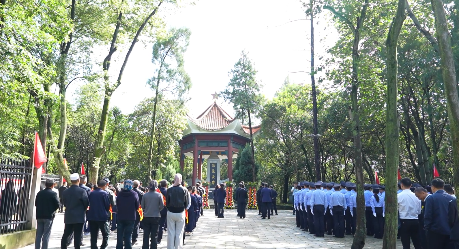 在深情的《献花曲》中,10名礼兵向烈士纪念碑敬献花篮。冯玉强缓步上前,认真整理花篮上的缎带。随后,参加公祭仪式的全体人员依次向烈士纪念碑献花,瞻仰烈士纪念碑。