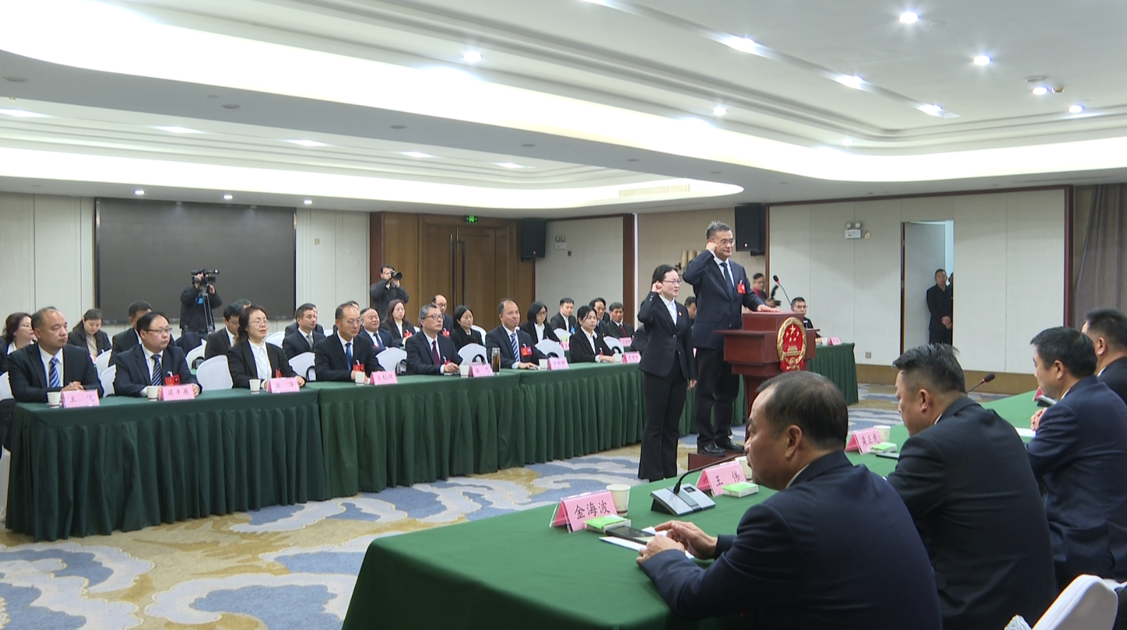 市人大常委会主任刘国强主持宪法宣誓仪式。市人大常委会副主任金同敬、侯继红、梁正虎、王良栋、王伟见证宣誓。