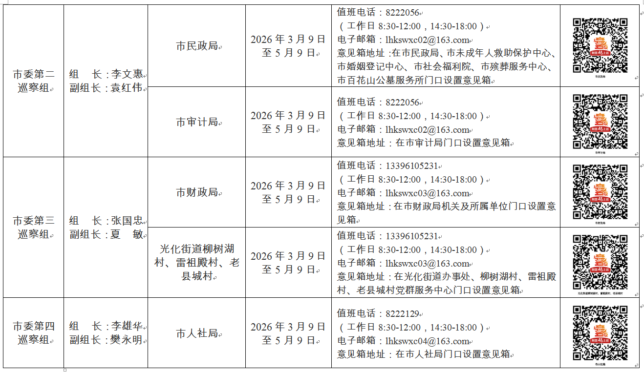 据悉,本轮巡察期间,各巡察组分别设置值班电话、电子邮箱、意见箱,开通“荆楚码上巡”线上反映问题渠道,主要受理反映被巡察单位党组织领导班子及其成员、下一级党组织领导班子主要负责人和重要岗位党员干部问题的来信来电,重点是关于违反政治纪律、组织纪律、廉洁纪律、群众纪律、工作纪律和生活纪律等方面的举报和反映。巡察组受理信访时间截止到2026年4月30日。