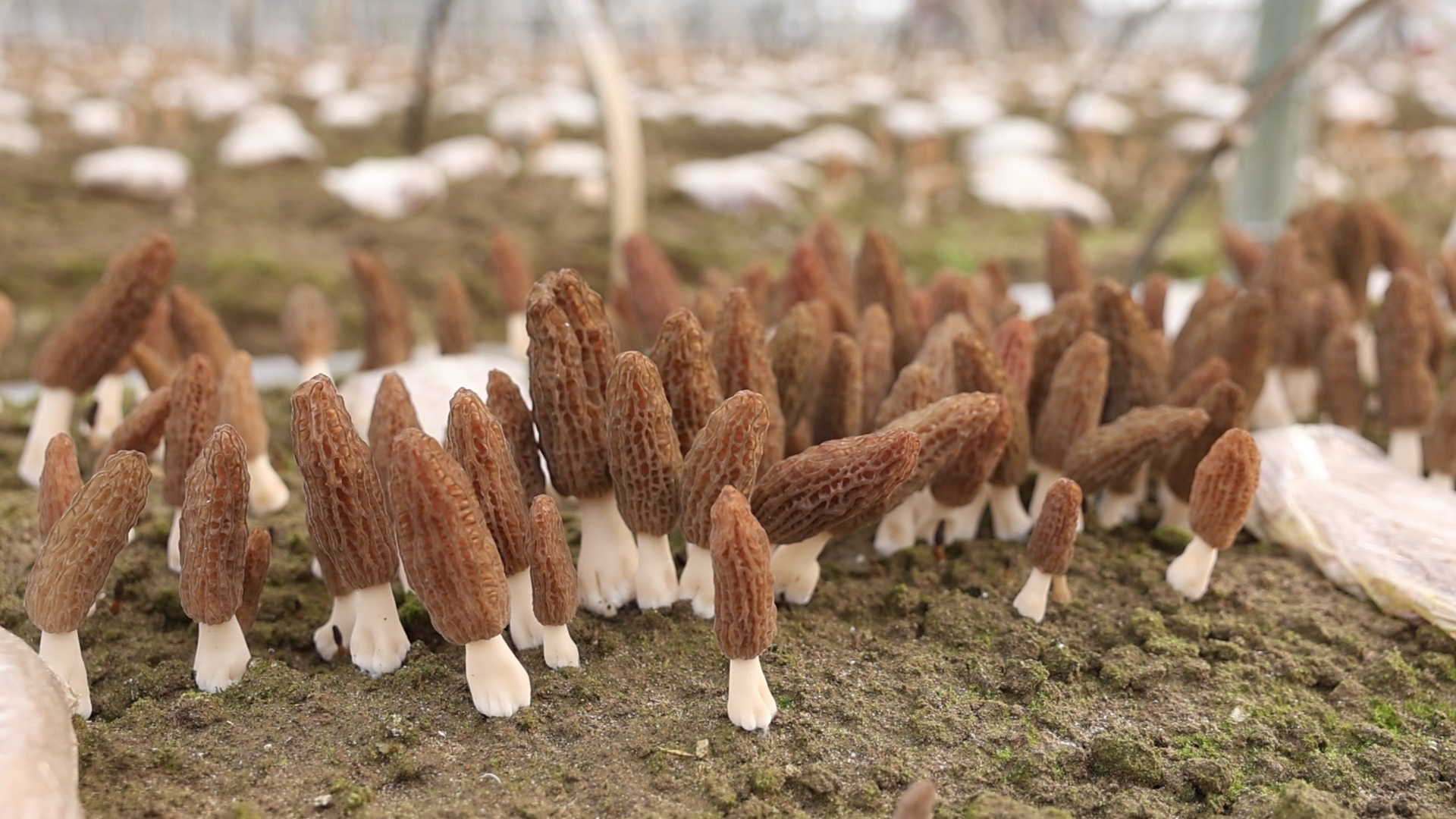 走进府洲村羊肚菌种植基地,一排排标准化大棚整齐排列,黑色遮阳网下,温暖湿润的气息扑面而来。掀开棚帘,眼前的景象令人欣喜:一朵朵羊肚菌撑着小巧的“褐色小伞”,如雨后春笋般破土而出,有的含苞待放、小巧玲珑,有的已然成熟、舒展饱满。村民们穿梭在菌棚中,细心采摘、分拣着成熟的羊肚菌,丰收的喜悦写在脸上。