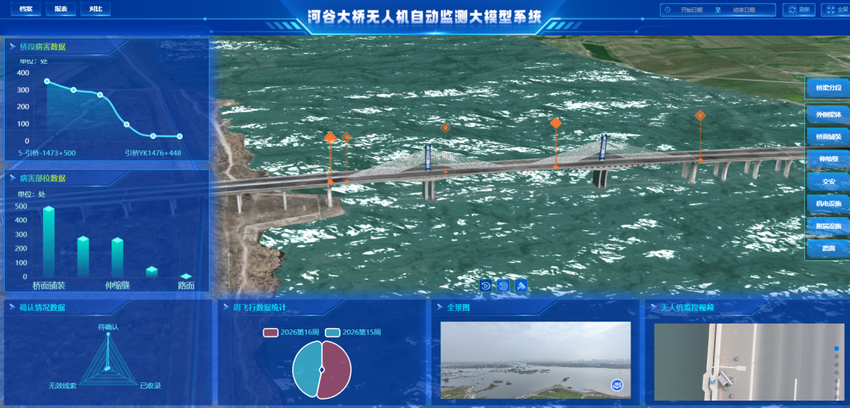 本项目覆盖316国道老河口市境内17.244公里路段及河谷汉江公路大桥(大桥全长4701.5米、主跨420米)。作为鄂陕物资运输重要通道,该路段日均车流量1.2万辆,重载车辆占比达28%,传统养护巡检长期面临效率低、覆盖不全、高空作业风险高等痛点。自试点工作启动以来,市公路建设中心联合技术合作单位中交一公局第一工程有限公司、中交一公局襄阳投资建设有限公司等单位,紧扣交通强国试点任务要求,以“智慧化、自动化、精准化”为方向,破解传统管养难题。
